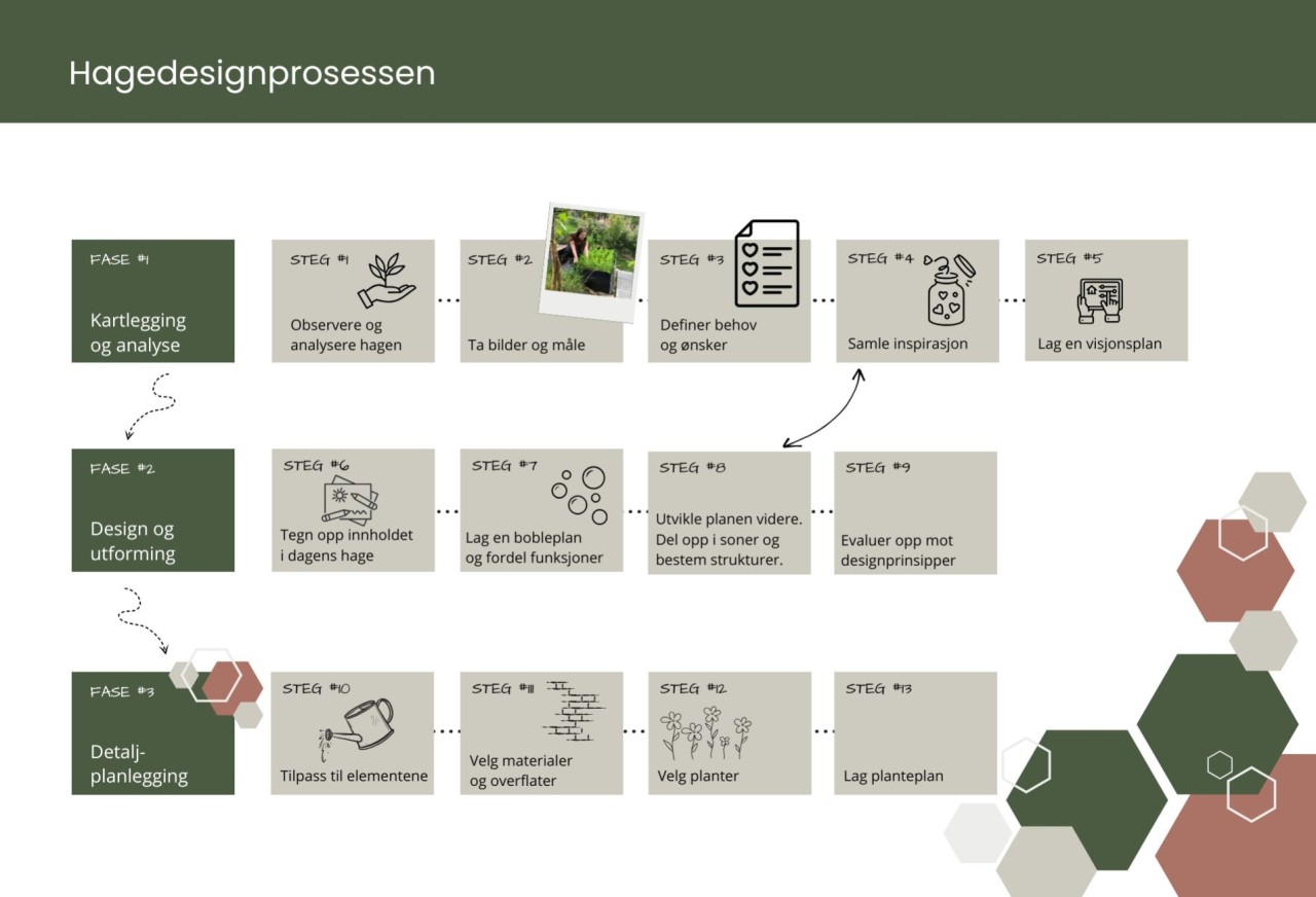 Mye faller på plass i en steg-for-steg tilnærming til hagen. Selv om du ikke vet hvordan og hva når du begynner, vil du få oversikt, gode idéer og finne løsninger underveis mens du jobber med planen.
